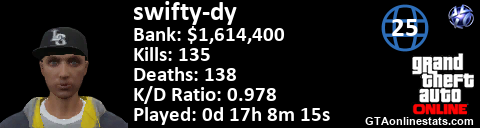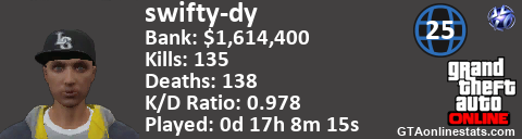 <a href="http://GTAonlinestats.com/showplayer/swifty-dy/2"><img src="http://GTAonlinestats.com/randomsignature/swifty-dy/2/sig.png" alt="swifty-dy" border="0" /></a>