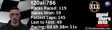 <a href="http://GTAonlinestats.com/showplayer/t20ali786"><img src="http://GTAonlinestats.com/racesignature/t20ali786/sig.png" alt="t20ali786" border="0" /></a>