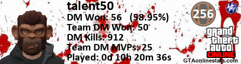 [URL=http://GTAonlinestats.com/showplayer/talent50][IMG]http://GTAonlinestats.com/dmsignature/talent50/sig.png[/IMG][/URL]
