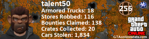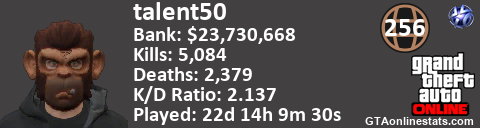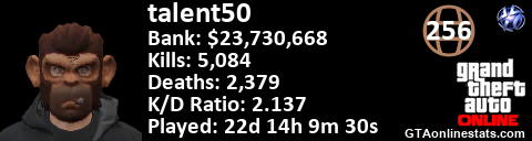 [URL=http://GTAonlinestats.com/showplayer/talent50][IMG]http://GTAonlinestats.com/signature/talent50/sig.png[/IMG][/URL]