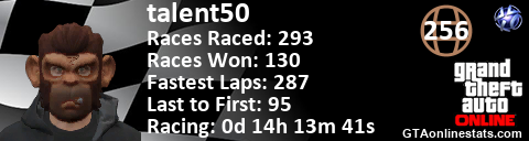 [URL=http://GTAonlinestats.com/showplayer/talent50][IMG]http://GTAonlinestats.com/racesignature/talent50/sig.png[/IMG][/URL]