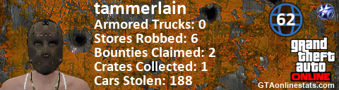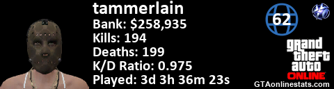 [URL=http://GTAonlinestats.com/showplayer/tammerlain/2][IMG]http://GTAonlinestats.com/signature/tammerlain/2/sig.png[/IMG][/URL]