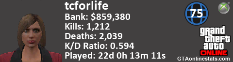 <a href="http://GTAonlinestats.com/showplayer/tcforlife"><img src="http://GTAonlinestats.com/randomsignature/tcforlife/sig.png" alt="tcforlife" border="0" /></a>