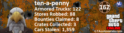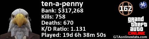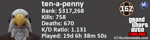 <a href="http://GTAonlinestats.com/showplayer/ten-a-penny"><img src="http://GTAonlinestats.com/randomsignature/ten-a-penny/sig.png" alt="ten-a-penny" border="0" /></a>