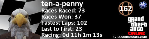 <a href="http://GTAonlinestats.com/showplayer/ten-a-penny"><img src="http://GTAonlinestats.com/racesignature/ten-a-penny/sig.png" alt="ten-a-penny" border="0" /></a>