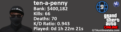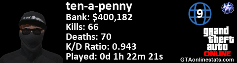 [URL=http://GTAonlinestats.com/showplayer/ten-a-penny/2][IMG]http://GTAonlinestats.com/signature/ten-a-penny/2/sig.png[/IMG][/URL]