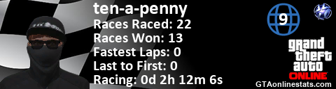 <a href="http://GTAonlinestats.com/showplayer/ten-a-penny/2"><img src="http://GTAonlinestats.com/racesignature/ten-a-penny/2/sig.png" alt="ten-a-penny" border="0" /></a>