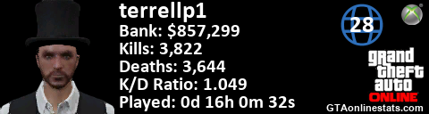 [URL=http://GTAonlinestats.com/showplayer/terrellp1][IMG]http://GTAonlinestats.com/signature/terrellp1/sig.png[/IMG][/URL]