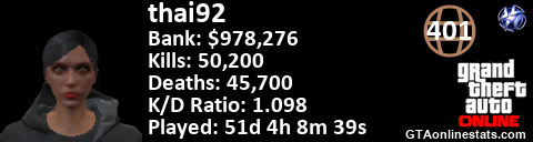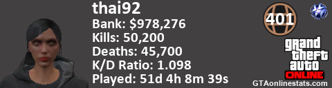 [URL=http://GTAonlinestats.com/showplayer/thai92][IMG]http://GTAonlinestats.com/dmsignature/thai92/sig.png[/IMG][/URL]