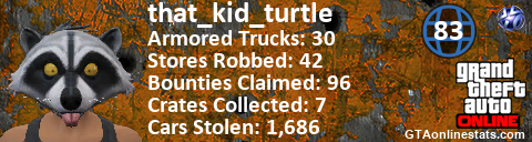 [URL=http://GTAonlinestats.com/showplayer/that_kid_turtle][IMG]http://GTAonlinestats.com/crimesignature/that_kid_turtle/sig.png[/IMG][/URL]