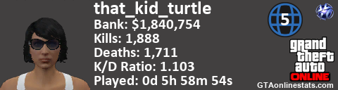 <a href="http://GTAonlinestats.com/showplayer/that_kid_turtle/2"><img src="http://GTAonlinestats.com/signature/that_kid_turtle/2/sig.png" alt="that_kid_turtle" border="0" /></a>