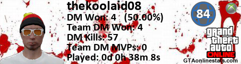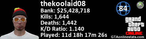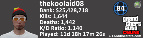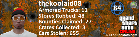 [URL=http://GTAonlinestats.com/showplayer/thekoolaid08/2][IMG]http://GTAonlinestats.com/dmsignature/thekoolaid08/2/sig.png[/IMG][/URL]