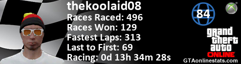 [URL=http://GTAonlinestats.com/showplayer/thekoolaid08/2][IMG]http://GTAonlinestats.com/racesignature/thekoolaid08/2/sig.png[/IMG][/URL]