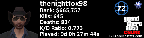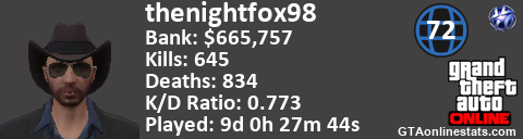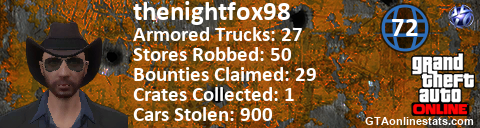 <a href="http://GTAonlinestats.com/showplayer/thenightfox98"><img src="http://GTAonlinestats.com/randomsignature/thenightfox98/sig.png" alt="thenightfox98" border="0" /></a>