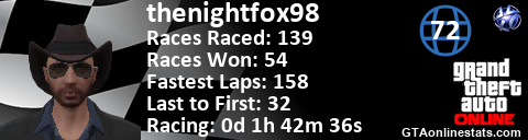 <a href="http://GTAonlinestats.com/showplayer/thenightfox98"><img src="http://GTAonlinestats.com/racesignature/thenightfox98/sig.png" alt="thenightfox98" border="0" /></a>