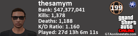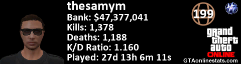 <a href="http://GTAonlinestats.com/showplayer/thesamym"><img src="http://GTAonlinestats.com/randomsignature/thesamym/sig.png" alt="TheSamyM" border="0" /></a>