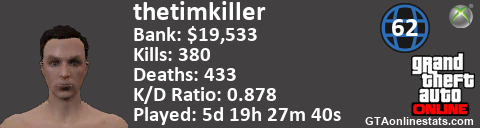<a href="http://GTAonlinestats.com/showplayer/thetimkiller"><img src="http://GTAonlinestats.com/signature/thetimkiller/sig.png" alt="thetimkiller" border="0" /></a>