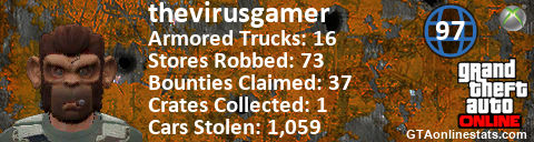 <a href="http://GTAonlinestats.com/showplayer/thevirusgamer"><img src="http://GTAonlinestats.com/randomsignature/thevirusgamer/sig.png" alt="TheVirusGamer" border="0" /></a>