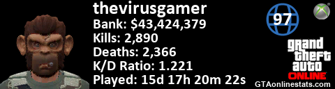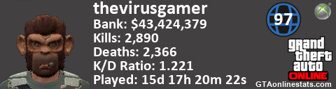 [URL=http://GTAonlinestats.com/showplayer/thevirusgamer][IMG]http://GTAonlinestats.com/signature/thevirusgamer/sig.png[/IMG][/URL]