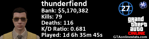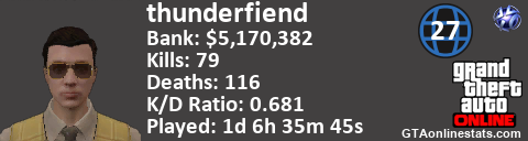 [URL=http://GTAonlinestats.com/showplayer/thunderfiend/2][IMG]http://GTAonlinestats.com/signature/thunderfiend/2/sig.png[/IMG][/URL]