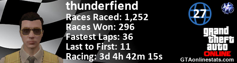 [URL=http://GTAonlinestats.com/showplayer/thunderfiend/2][IMG]http://GTAonlinestats.com/racesignature/thunderfiend/2/sig.png[/IMG][/URL]
