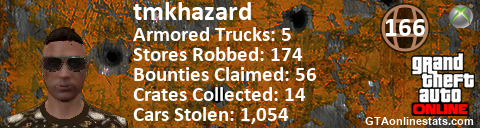 [URL=http://GTAonlinestats.com/showplayer/tmkhazard][IMG]http://GTAonlinestats.com/signature/tmkhazard/sig.png[/IMG][/URL]