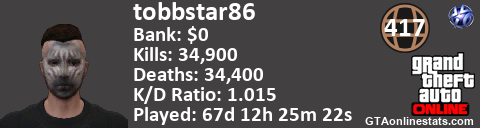 [URL=http://GTAonlinestats.com/showplayer/tobbstar86][IMG]http://GTAonlinestats.com/randomsignature/tobbstar86/sig.png[/IMG][/URL]