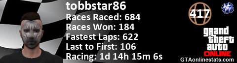 <a href="http://GTAonlinestats.com/showplayer/tobbstar86"><img src="http://GTAonlinestats.com/racesignature/tobbstar86/sig.png" alt="tobbstar86" border="0" /></a>