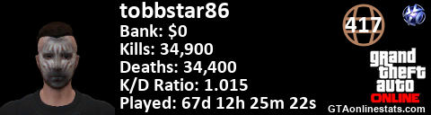 <a href="http://GTAonlinestats.com/showplayer/tobbstar86"><img src="http://GTAonlinestats.com/dmsignature/tobbstar86/sig.png" alt="tobbstar86" border="0" /></a>