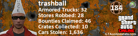 [URL=http://GTAonlinestats.com/showplayer/trashball][IMG]http://GTAonlinestats.com/crimesignature/trashball/sig.png[/IMG][/URL]