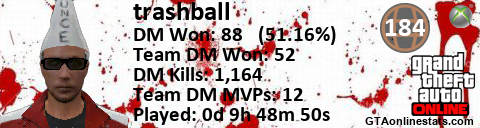 [URL=http://GTAonlinestats.com/showplayer/trashball][IMG]http://GTAonlinestats.com/dmsignature/trashball/sig.png[/IMG][/URL]