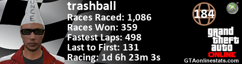 <a href="http://GTAonlinestats.com/showplayer/trashball"><img src="http://GTAonlinestats.com/racesignature/trashball/sig.png" alt="trashball" border="0" /></a>