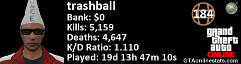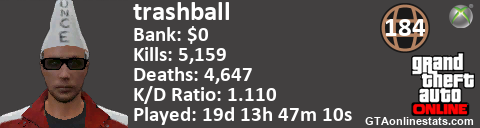 <a href="http://GTAonlinestats.com/showplayer/trashball"><img src="http://GTAonlinestats.com/greysignature/trashball/sig.png" alt="trashball" border="0" /></a>