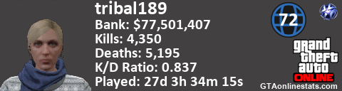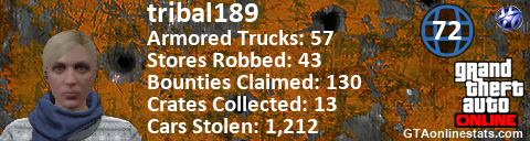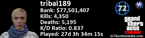 <a href="http://GTAonlinestats.com/showplayer/tribal189"><img src="http://GTAonlinestats.com/signature/tribal189/sig.png" alt="tribal189" border="0" /></a>