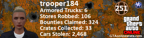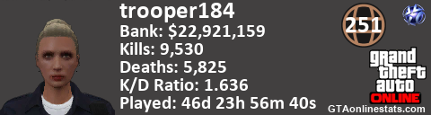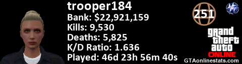 <a href="http://GTAonlinestats.com/showplayer/trooper184"><img src="http://GTAonlinestats.com/randomsignature/trooper184/sig.png" alt="TROOPER184" border="0" /></a>