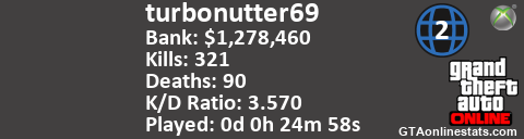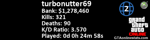 [URL=http://GTAonlinestats.com/showplayer/turbonutter69/2][IMG]http://GTAonlinestats.com/signature/turbonutter69/2/sig.png[/IMG][/URL]