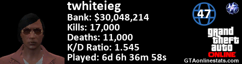 [URL=http://GTAonlinestats.com/showplayer/twhiteieg/2][IMG]http://GTAonlinestats.com/signature/twhiteieg/2/sig.png[/IMG][/URL]