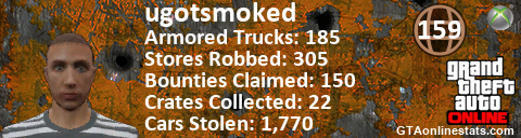 [URL=http://GTAonlinestats.com/showplayer/ugotsmoked][IMG]http://GTAonlinestats.com/crimesignature/ugotsmoked/sig.png[/IMG][/URL]