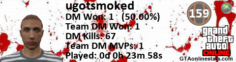 [URL=http://GTAonlinestats.com/showplayer/ugotsmoked][IMG]http://GTAonlinestats.com/dmsignature/ugotsmoked/sig.png[/IMG][/URL]
