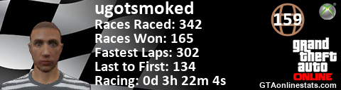 <a href="http://GTAonlinestats.com/showplayer/ugotsmoked"><img src="http://GTAonlinestats.com/racesignature/ugotsmoked/sig.png" alt="ugotsmoked" border="0" /></a>