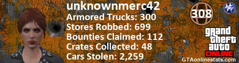 [URL=http://GTAonlinestats.com/showplayer/unknownmerc42][IMG]http://GTAonlinestats.com/randomsignature/unknownmerc42/sig.png[/IMG][/URL]