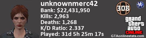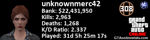 <a href="http://GTAonlinestats.com/showplayer/unknownmerc42"><img src="http://GTAonlinestats.com/randomsignature/unknownmerc42/sig.png" alt="unknownmerc42" border="0" /></a>