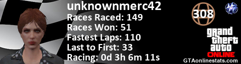 <a href="http://GTAonlinestats.com/showplayer/unknownmerc42"><img src="http://GTAonlinestats.com/racesignature/unknownmerc42/sig.png" alt="unknownmerc42" border="0" /></a>