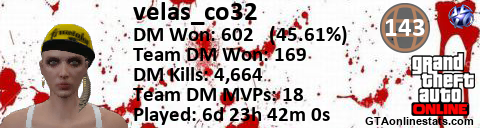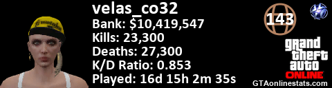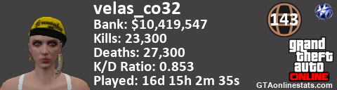 [URL=http://GTAonlinestats.com/showplayer/velas_co32][IMG]http://GTAonlinestats.com/dmsignature/velas_co32/sig.png[/IMG][/URL]
