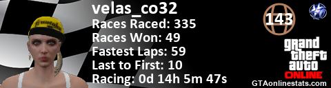 [URL=http://GTAonlinestats.com/showplayer/velas_co32][IMG]http://GTAonlinestats.com/racesignature/velas_co32/sig.png[/IMG][/URL]