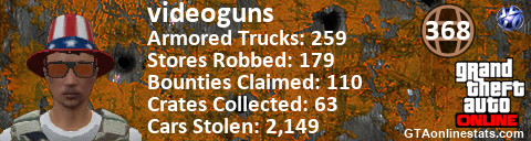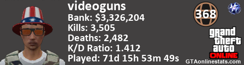 [URL=http://GTAonlinestats.com/showplayer/videoguns][IMG]http://GTAonlinestats.com/signature/videoguns/sig.png[/IMG][/URL]