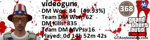 [URL=http://GTAonlinestats.com/showplayer/videoguns][IMG]http://GTAonlinestats.com/dmsignature/videoguns/sig.png[/IMG][/URL]