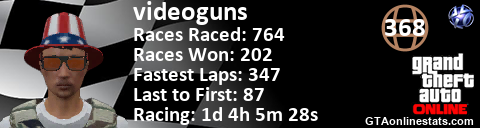 [URL=http://GTAonlinestats.com/showplayer/videoguns][IMG]http://GTAonlinestats.com/racesignature/videoguns/sig.png[/IMG][/URL]