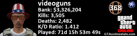 <a href="http://GTAonlinestats.com/showplayer/videoguns"><img src="http://GTAonlinestats.com/signature/videoguns/sig.png" alt="ViDeoGuns" border="0" /></a>