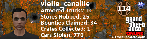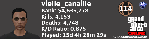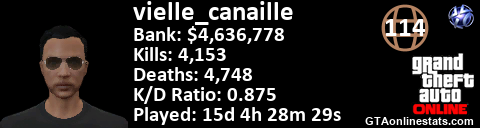 [URL=http://GTAonlinestats.com/showplayer/vielle_canaille][IMG]http://GTAonlinestats.com/signature/vielle_canaille/sig.png[/IMG][/URL]